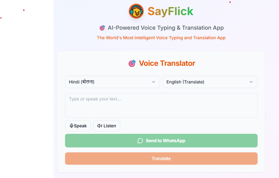 SayFlick.com introduces an easy and lightning-fast way to convert your spoken words into accurate text and translations — all in real time. Whether you’re a student, a content creator, or just someone who wants to speak in one language and get the result in another, the SayFlick Voice Translator is built for you.